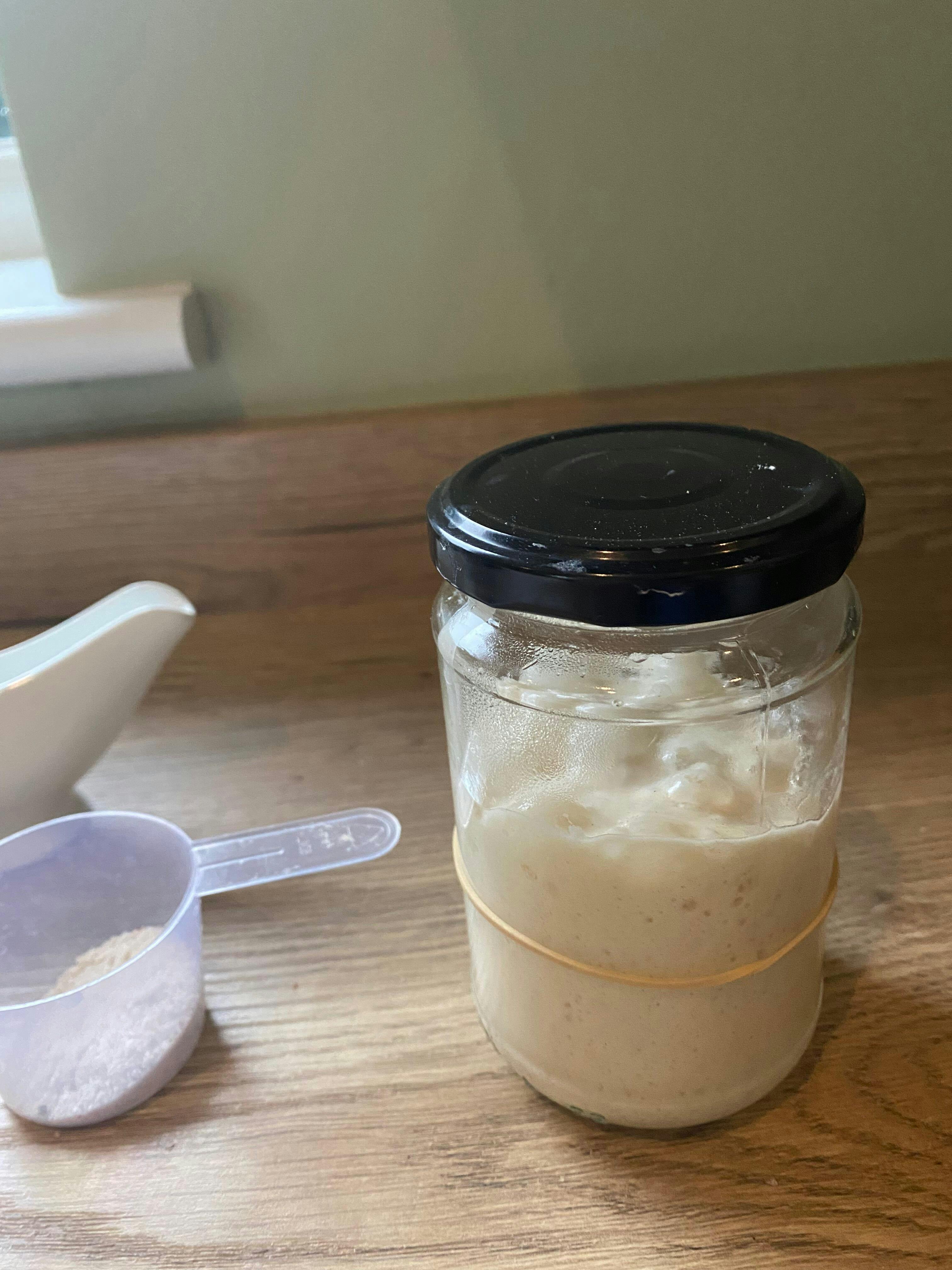 A jar of my own Leicestershire-grown starter - the same culture that powers my micro-bakery each week. -